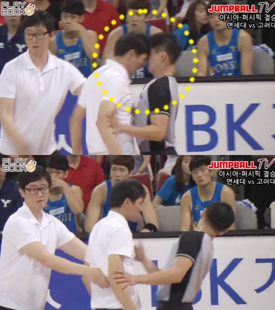 하프라인 부근에서 연세대 최준용이 골밑슛을 시도할 때 고려대 이승현이 수비를 했는데 정재근 감독은 파울이라고 여긴 반면 심판은 파울을 불지 않았다.