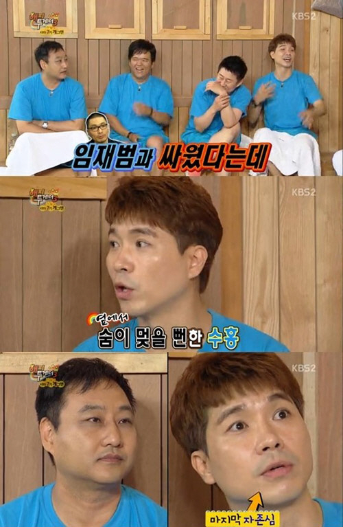 이어 박수홍은 "둘이 눈싸움을 했다. 말이 새나가는 순간 싸움이 시작되니 김수용이 복화술로 '오늘 관 짜라'고 했다"면서 "그런데 임재범이 다가오더니 '(눈) 깔아'라고 하더라. 하지만 김수용이 기가 죽지 않고 맞붙자 임재범이 피우고 있던 담배를 자신의 몸에 지졌다"고 말해 두 눈을 휘둥그레지게 했다.