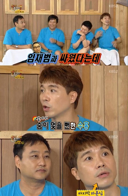 이어 박수홍은 "둘이 눈싸움을 했다. 말이 새나가는 순간 싸움이 시작되니 김수용이 복화술로 '오늘 관 짜라'고 했다"면서 "그런데 임재범이 다가오더니 '(눈) 깔아'라고 하더라. 하지만 김수용이 기가 죽지 않고 맞붙자 임재범이 피우고 있던 담배를 자신의 몸에 지졌다"고 말해 모두를 놀라게 했다.