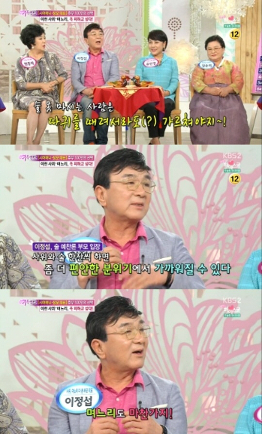 이정섭은 '술을 좋아하는 사위 or 며느리 싫다 좋다?'에 대해 "술을 못 마시면 따귀를 때려서라도 가르쳐야 한다"고 말해 눈길을 끌었다.