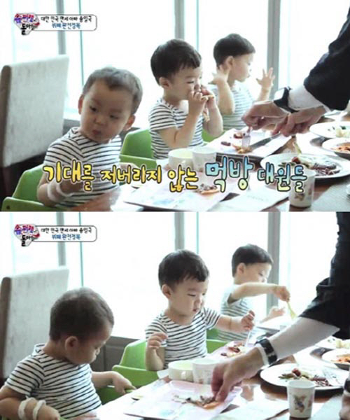 하지만 세 쌍둥이는 "좋다!", "우와 고기다!"를 외치는 등 기뻐해 송일국의 괴로움은 한결 덜했다.