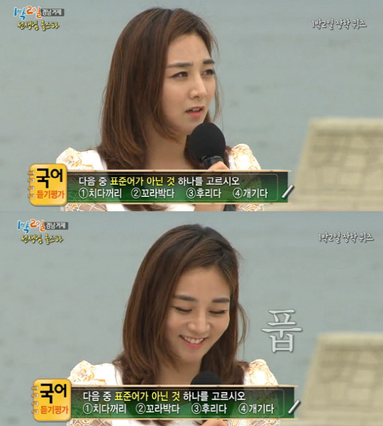 이날 정다은 아나운서는 실내취침이 걸려있는 '장학퀴즈' 게임 진행자로 등장해 '1박2일' 멤버들의 시선을 한 몸에 받았다. 특히 그녀는 단아한 외모와 깔끔한 진행 솜씨를 선보이며 매력을 발산했다.