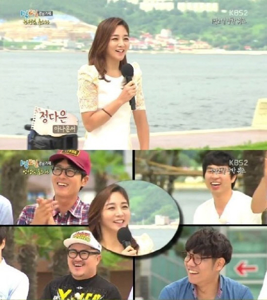 이날 방송에서는 실내취침이 걸려있는 '장학퀴즈' 게임 진행자로 정다은 아나운서 깜짝 출연했다. 단아한 미모와 웃는 모습이 매력적인 정다은 아나운서는 깔끔한 진행 솜씨로 이목을 집중시켰다.