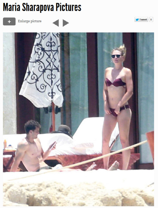 샤라포바는 자주색 비키니를 입고 근육질의 날씬한 몸매를 과시했다. 특히 그는 남자친구 디미트로프 앞에서 수영복을 정리하는 모습을 보여 민망한 상황을 연출하기도 했다.