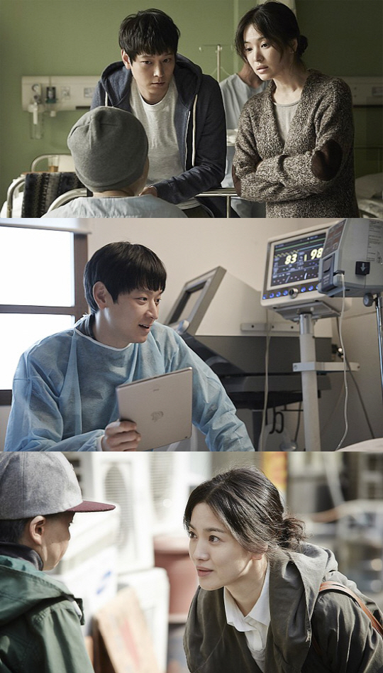 배우 강동원-송혜교 주연 영화 '두근두근 내 인생'의 스틸컷이 공개됐다. 두 사람은 조로증에 걸린 아들을 둔 젊은 부부역을 맡았다.