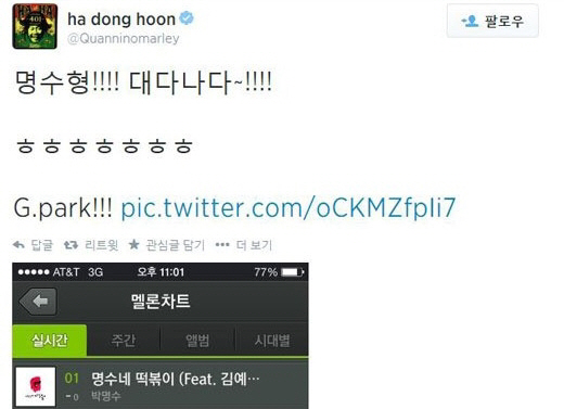 이에 가수 하하는 자신의 트위터를 통해 박명수의 신곡이 음원차트에서 1위를 차지한 사진과 함께 "명수형, 대단하다"라는 글을 게재했다.