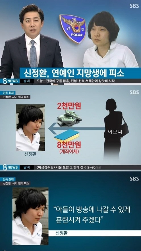 16일 SBS '8시뉴스'는 해외불법도박 혐의로 실형을 선고받았던 신정환이 해당 사건 바로 직전 한 연예인 지망생 부모에게 억대의 돈을 받은 혐의로 피소됐다고 보도했다.