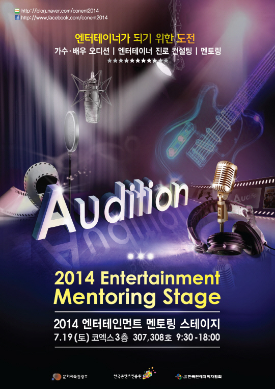 문화체육관광부와 한국콘텐츠진흥원이 주최하고 한국연예제작자협회가 후원하는 '2014 엔터테인먼트 멘토링 스테이지'가 오는 19일 코엑스 3층(307호, 308호)에서 개최된다.