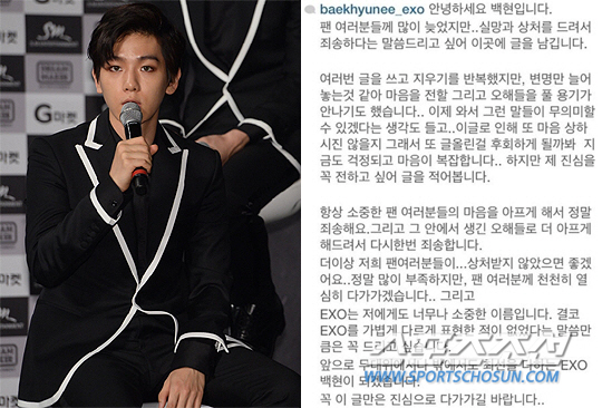 또 백현은 "더이상 저희 팬 여러분들이 상처받지 않았으면 좋겠어요. 정말 많이 부족하지만, 팬 여러분께 천천히 열심히 다가가겠습니다"라며 "그리고 EXO는 저에게도 너무나 소중한 이름입니다. 결코 EXO를 가볍게 다르게 표현한 적이 없었다는 말씀만큼은 꼭 드리고 싶습니다"라고 전했다.