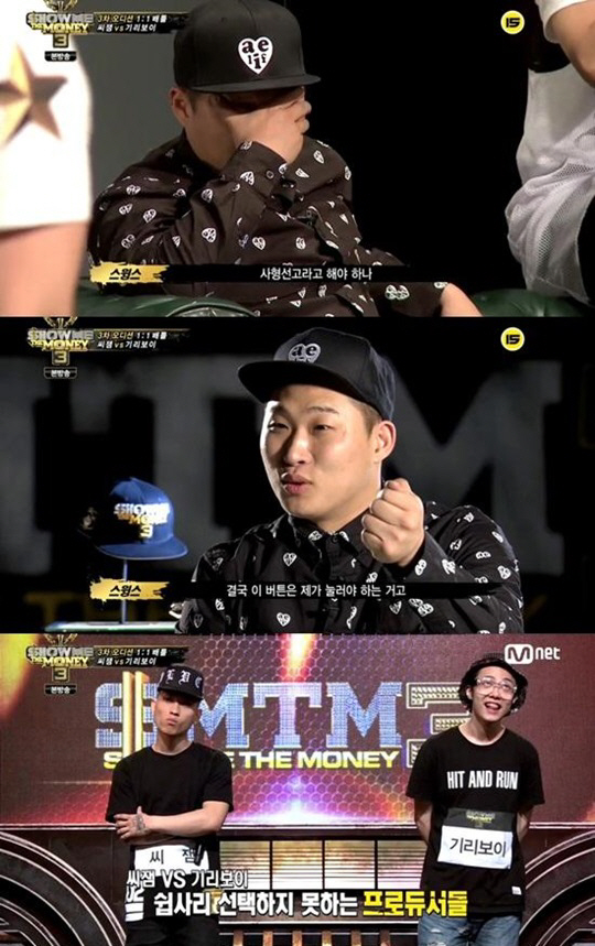 이후 씨잼과 기리보이는 프로듀서가 흡족해할 만큼의 랩을 선보였고, 그 결과 스윙스를 제외한 심사위원들은 반반씩 꼽으며 동점을 받게 돼 3차 오디션 2차 대결을 펼치게 됐다.