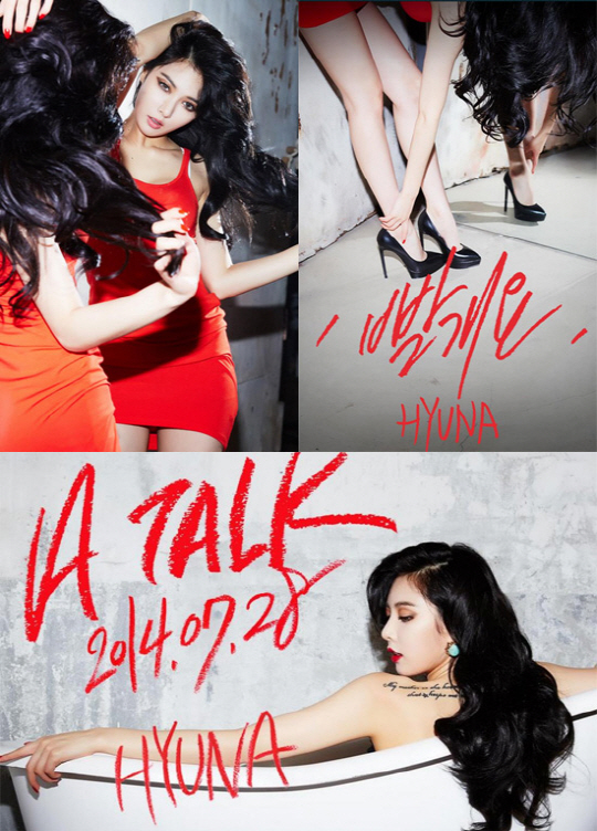 17일 소속사 큐브엔터테인먼트 측은 공식 SNS를 통해 "20140728 HYUNA 3rd Mini Album 'A TALK' 타이틀곡 '빨개요(Red)' 티저 이미지 공개"라는 글과 함께 다수의 사진을 게재했다.