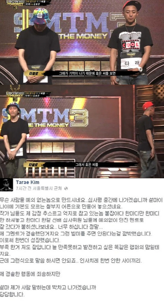 이는 17일 방송된 Mnet '쇼미더머니3'에서 타래가 김효은과의 1대 1배틀에서 패한 후, 타블로의 심사평이 끝나기도 전에 자리를 박차고 나와 태도 문제로 논란을 받았다.