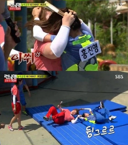 그러자 홍진영은 자신을 놀리는 이국주와 서로의 머리채를 붙잡고 쓰러지는 모습을 보여 주변에 웃음을 전했다. 또 쓰러졌던 이국주는 일어서며 홍진영에게 "까불지 마라"라고 경고해 또 한 차례 웃음을 자아냈다.