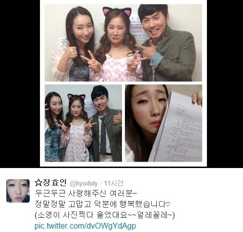 지난 20일 장효인은 자신의 트위터에 "개그콘서트 '두근두근' 사랑해주신 여러분. 정말 고맙고 덕분에 행복했습니다"라는 글과 함께 사진을 게재했다.