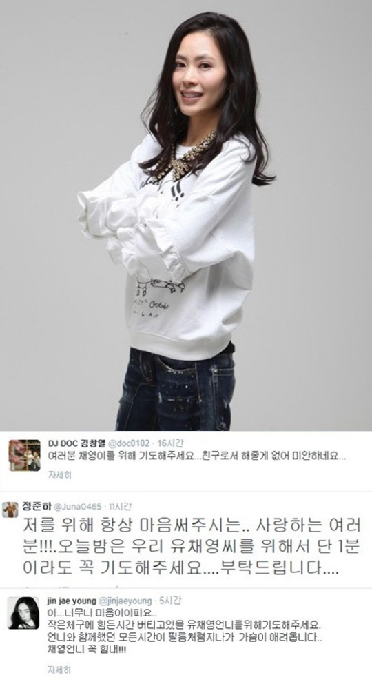 가수 출신 연기자 유채영(41)이 위암 말기 판정을 받은 것으로 전해진 가운데, 동료 연예인들의 응원 메시지가 이어지고 있다.