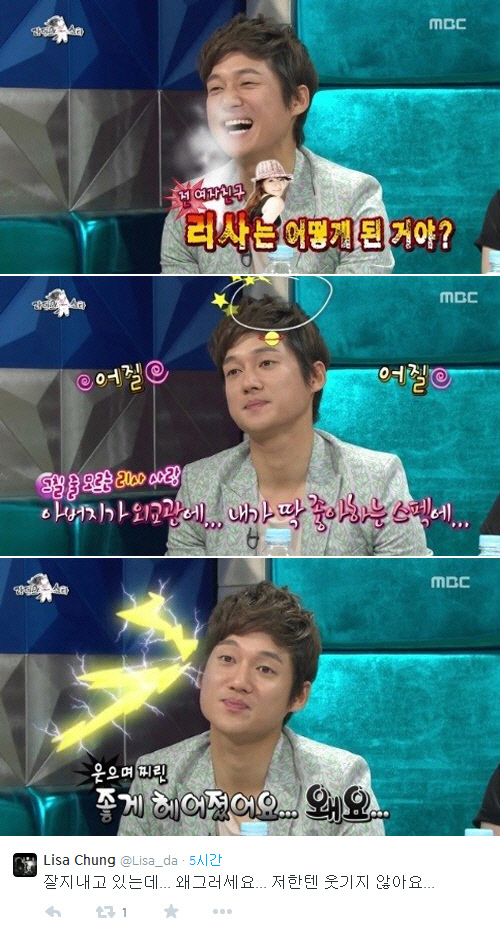 리사는 24일 자신의 트위터에 "잘지내고 있는데 왜 그러세요. 저한텐 웃기지 않아요"라며 23일 밤 방송된 '라디오스타'에 대해 일침을 날렸다.