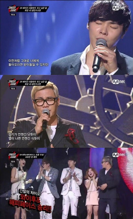 가수 휘성과 윤민수가 기획사 대표로 나서 날카로운 신경전을 펼친 가운데, 윤민수의 와이후 레이블이 '싱어게임' 1회에서 우승을 차지했다.