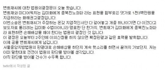 이와 관련해 김미화는 자신의 트위터에 "변희재 씨에 대한 법원의 결정문이 오늘 왔습니다. 변희재와 미디어워치는 김미화에게 종북친노좌파 라는 표현을 함부로 쓴 대가로 1천3백만원을 지급하라는 화해권고결정입니다"라고 글을 올렸다.