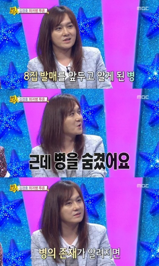 김경호는 "병을 숨겼다. 그런 모습이 알려지면 불러주지도 않고 가수를 그만둬야 할까 두려워 숨기고 공연했다. 너무 많이 병세가 진행돼 결국 무대에서 8집 활동을 하지 못하게 됐다"고 설명했다.