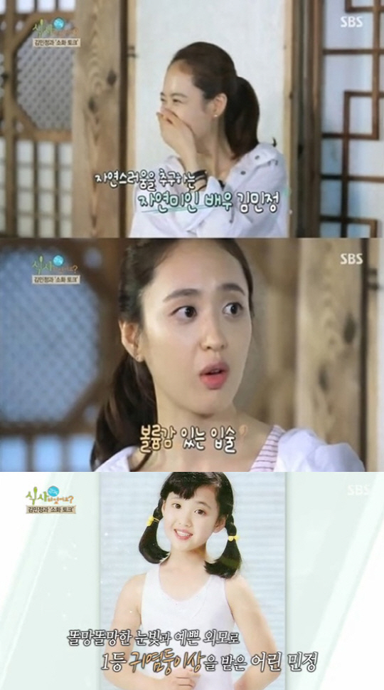 특히 이날 방송에서는 김민정의 어린 시절 모습이 공개, 똘망 똘망한 눈빛과 또렷한 이목구비로 모태미녀임을 입증했다. 그는 "이모가 유아복 선발대회에 재미로 사진을 넣으셨는데 1등에 뽑혔다"며 "그것이 계기가 돼 지금 여기까지 왔다"고 말했다.