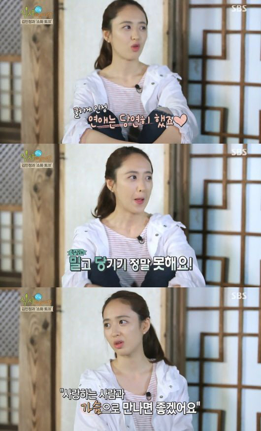 김민정은 "밀당하는 남자하고 연애할 때는 도대체 뭘 하자고 하는지 모르겠다"며 "삶이 호락호락 하지 않는데 그런 사람 만나면서 힘들고 싶지 않다. 가슴으로 만났으면 좋겠다"며 자신의 생각을 이야기했다.