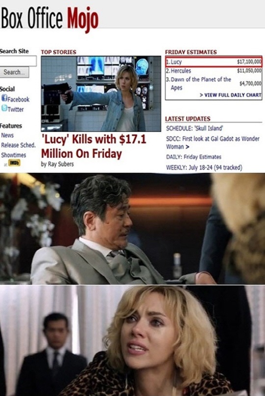 지난 25일(현지시간) '루시'는 북미 전역에서 개봉했으며, 박스오피스모조닷컴기준 약 1710만 달러의 수입을 기록하며 일일 흥행순위 1위를 달성했다.