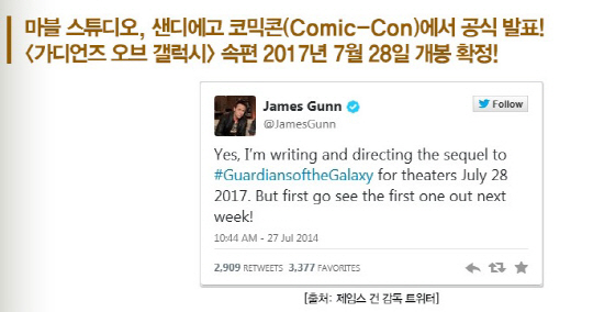 마블 스튜디오가 지난 26일 미국 샌디에고에서 열린 코믹콘(Comic-Con)에서 2017년 여름, '가디언즈 오브 갤럭시'의 속편 개봉을 예정하고 있다고 공식 발표한 것.