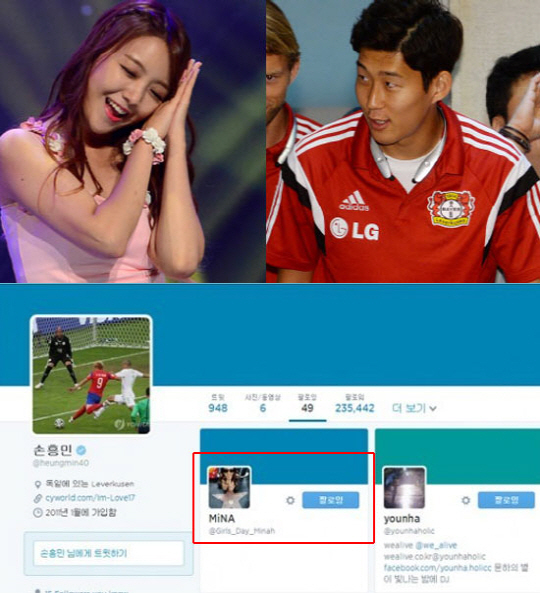 SNS를 통해 인연을 맺어 연인으로 발전한 레버쿠젠 손흥민 선수와 걸그룹 걸스데이 민아의 트위터 팔로잉 리스트가 주목받고 있다.