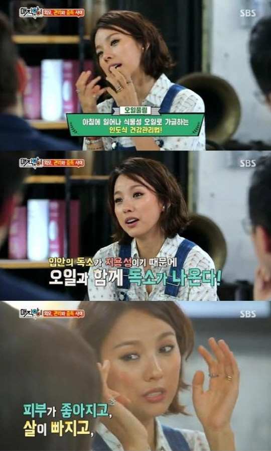 또 "민간요법 같은 거라 과학적 근거는 없지만 독소가 나가기 때문에 피부도 좋아지고, 살도 빠지고, 혈색도 좋아진다는 말이 있다"고 밝혔다. 이어 "내 주변에는 오일 풀링으로 효과를 본 사람이 많다"고 덧붙였다.