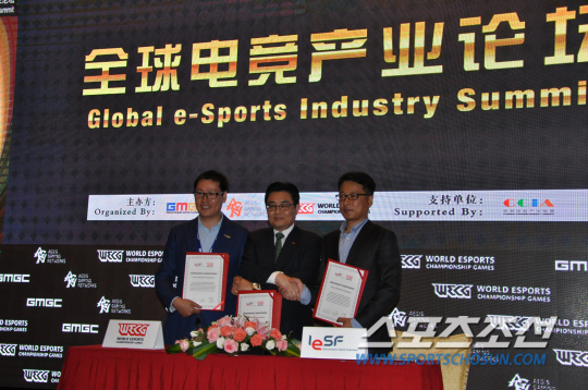 ◇30일 중국 상하이 쉐라톤호텔에서 열린 글로벌 e스포츠 인더스트리 서미트에서 국제e스포츠연맹 전병헌 회장(가운데)이 WECG 공동 개최사인 AGN 전명수 대표(오른쪽)와 GMCC 데이비드 송 대표에게 국제e스포츠연맹 공식 인증서를 전달하고 있다.