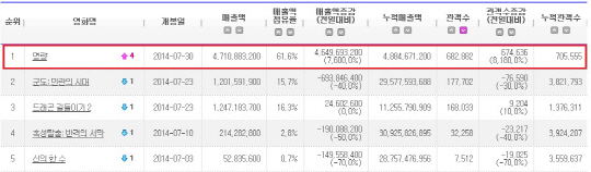 이는 영화 '군도:민란의 시대'가 지난 주 세운 오프닝 스코어 55만1290명을 13만 명 이상 뛰어 넘는 신기록이다. 또 추석 연휴와 개천절로 이어지는 징검다리 휴일 특수가 있었던 영화 '광해, 왕이 된 남자'(1,232만 관객)가 기록한 역대 최고 평일 스코어 67만2469명을 능가하는 최고의 평일 스코어 신기록을 세웠다.