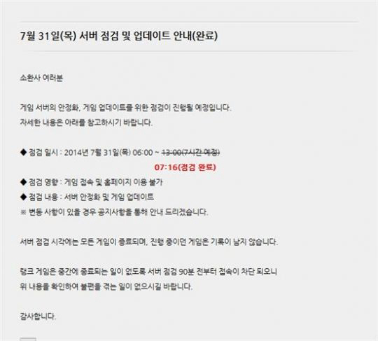 그러나 이번 점검은 금일 오전 6시부터 오후 1시까지 진행될 예정이었으나 이보다 약 6 시간 빠른 오전 7시16분 업데이트가 종료됐다.