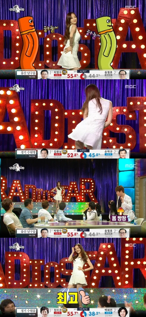 이에 '라디오스타' MC와 게스트 유상무 조관우 김가연은 눈을 떼지 못했고, MC 윤종신은 "느낌이 좋다. 육감적이다"라고 극찬했다.