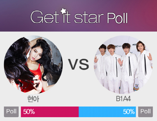 스타 스타일 매거진 앱 '겟잇스타'의 'Get it Star POLL' 의 110번째 대결은 스타들이 출연하는 리얼리티 프로그램으로 현아와 B1A4가 그 주인공입니다.