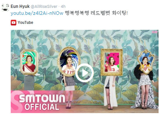1일 은혁은 자신의 트위터에 "행복 행복행 레드벨벳 화이팅!"이라는 글과 함께 레드벨벳 '행복' 뮤직비디오 영상을 게재했다.