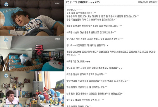 심형탁은 "방송은 아직 못 봤습니다. 오늘 아버지 일 돕고 좀 피곤해서 조금 전에 일어났습니다. 많은 주변 분들이 기사 주소 보내주셔서 읽어보았어요. 취미를 나쁘게만 보시지 않는 것 같아 마음이 한결 편해지네요"라고 적었다.