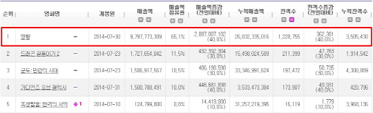 영화 '명량'이 지난 2일 주말 하루 동안 122만8755명 관객을 동원하며 최초로 일일 122만명 이상의 스코어 기록을 달성했다. 더불어 개봉 4일 만에 역대 최단기간 300만 관객 돌파 기록도 세웠다.