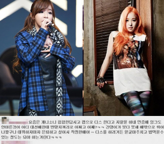 지난 4일 박봄 코디로 알려진 배 모씨는 자신의 SNS에 케미의 포털사이트 프로필 사진을 올린 뒤 "요즘은 개나 소나 힙합 한답시고 랩으로 디스한다고 XX을 하네. 민증에 잉크도 안 마른 것이 어디 대선배한테 반말지거리로 어쩌고 어째? 간덩이가 붓다 못해 배 밖으로 튀어나왔구나. 데뷔하자마자 은퇴하고 싶어서 작정한 애야. 디스를 하려거든 얼굴 마주치고 밥 먹을 수 있는 정도는 돼야 하는 거란다"라는 글을 게재했다.