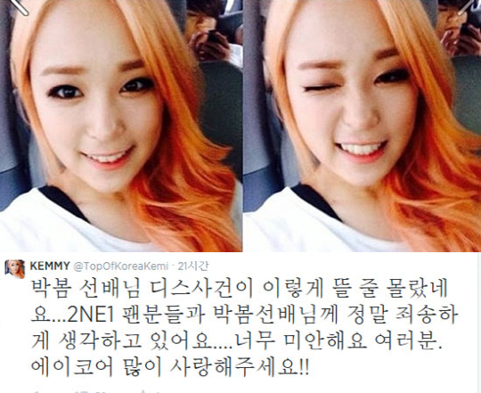 힙합 걸그룹 에어코어 멤버 케미가 2EN1 박봄을 겨냥한 디스곡으로 논란의 중심에 서자, 직접 사과의 글을 게재했다.