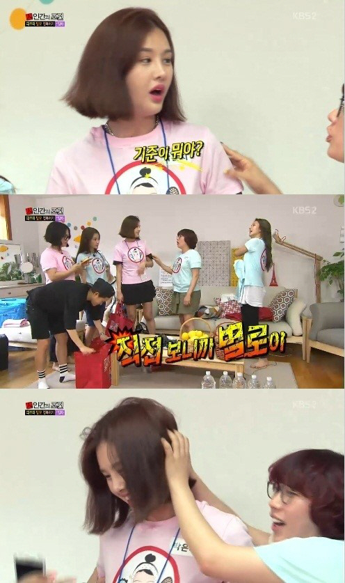 김영희는 9일 오후 방송된 KBS 2TV '인간의 조건'에서 새 멤버 소개 때 박은지에게 "내가 봤을 때 박은지보다 내가 더 예쁜 것 같다"면서 "박은지가 TV로 봤을 때는 예뻤는데, 직접 보니 실물이 별로다"라고 말해 멤버들이 박장대소했다.