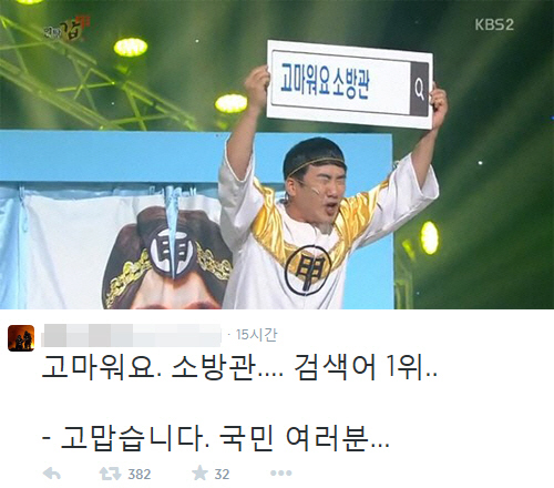 자신을 현직 소방관이라 밝힌 한 네티즌은 11일 트위터를 통해 "고마워요 소방관 검색어 1위…고맙습니다. 국민 여러분"이라고 글을 남겼다.