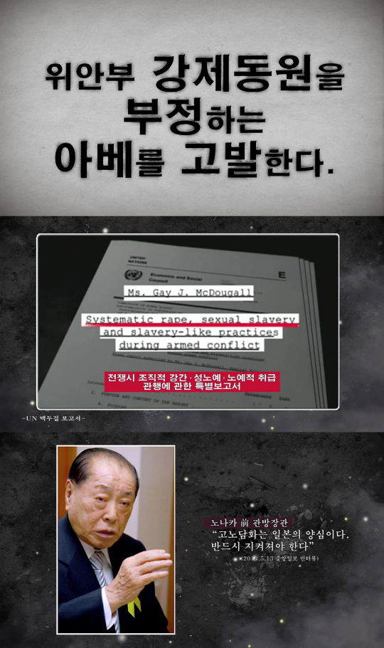4분30초 분량의 이번 동영상은 고노담화의 정의 설명, 미국 오바마 대통령과 중국 시진핑 주석의 일본군 위안부 관련 인터뷰 영상, 국제사회의 비판 현황, 독일과 일본의 비교 등을 담아 한국어(http://is.gd/Se5WeS)와 영어(http://is.gd/kija7V)로 각각 제작했다.