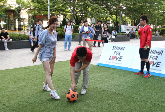 지난 4월부터 시작된 '슛포러브'는 도심 한복판에 설치된 게릴라 축구장에서 시민들이 한 골을 성공시킬 때마다 5천원이 소아암 환아의 치료비로 기부되며, 1000골이 모이면 소아암 환아 1명의 생명을 구할 수 있다는 취지의 캠페인이다.