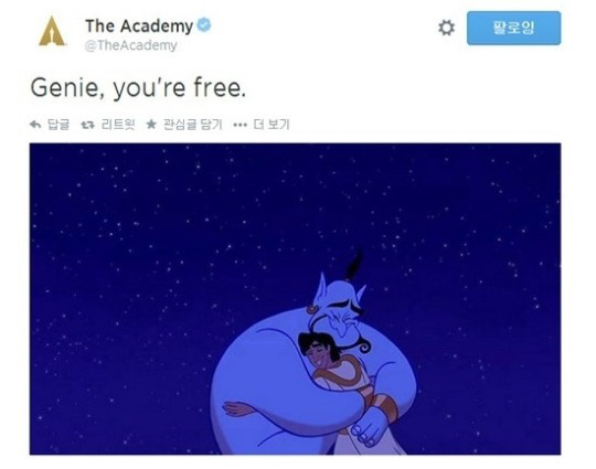아카데미는 12일(한국시각) 공식 트위터를 통해 "지니, 이제 넌 자유야"라는 글과 함께 디즈니 애니메이션 '알라딘'의 이미지를 올렸다.