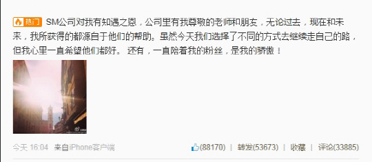 한경은 13일 자신의 웨이보(중국판 트위터)에 "SM엔터테인먼트의 은혜는 안다. 내가 존경하는 선생님과 친구들이 거기에 있다"고 밝혔다. 그는 "아무리 시간이 지났어도 내가 얻은 모든 것은 그들의 도움이다. 비록 내가 지금 다른 방식을 택했고, 내 자신의 길을 계속 가더라도 그들이 모두 잘 되길 바란다"고 전했다.