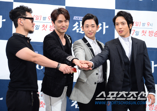 12일 오후 서울 강남구 논현동 임피리얼 팰리스 호텔에서 tvN 드라마 '삼총사' 제작발표회가 열렸다. 양동근, 이진욱, 정용화, 정해인이 포토타임에서 포즈를 취하고 있다.