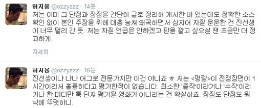 허지웅은 13일 자신의 트위터를 통해 "진 선생이나 저나 '어그로' 전문가지만 이건 아니죠. 저는 '명량'이 전쟁 장면이 1시간이라서 훌륭하다고 평가한 적이 없습니다. 최소한 '졸작'이라거나 '수작'이라거나 한 마디만 툭 던져 평가될 영화가 아니라는 건 확실하죠. 장점도 단점도 워낙에 뚜렷하니"라고 글을 올렸다.