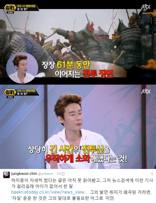 앞서 허지웅은 지난 7일 방송된 JTBC '썰전'에서 "'명량'의 영화사적 공헌을 꼽는다면 역시 전쟁 신을 거의 1시간에 가깝게 풀어냈다는 건데 이런 건 사실 할리우드 영화에서도 하기 어려운 거다. 지루할 수밖에 없으니까. 어찌 됐든 (명량은) 해냈다라는 것"이라고 영화 '명량'에 대해 평했다. 이어 "중간에 보면 약간 편집 점이 많이 끊어지고 연결이 어지러운 부분도 있다. 편집이 매끄럽게 되진 않았지만, 어찌 됐든 우직하게 해냈다는 점에서 점수를 주고 싶다"고 말한 바 있다.