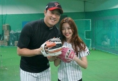 공개된 사진 속 레이디제인은 봉중근 선수와 나란히 서서 환하게 웃으며 카메라를 응시하고 있는 모습이다.