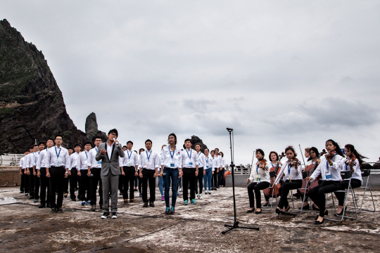 머리가 흩날릴 정도의 바람이 부는 가운데 시작된 공연은 이승철의 지휘 아래 리메이크로 제작한 '홀로 아리랑'을 합창으로 들려주는 것으로 시작됐다. 노래 도중 탈북청년합창단 단원인 김영호(31)씨가 통일을 기원하는 독도 선언문을 낭독했다.